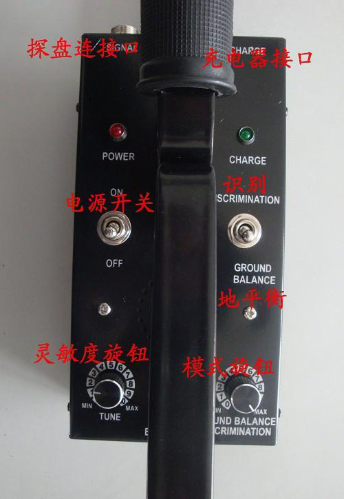 4、将探头靠近地面,离地10-15厘米左右,这是如果“临界声”增大了,就抬起探头、按下按钮,把工作调节旋钮向左(反时针方向)旋钮一点,放开按钮,靠近地面再试,如果声音仍然增大,又可再按上述程序把工作调节旋钮向左旋转一点再试,经过数次调整之后,直到探头抬起和放下“临界声”没有变化了,地平衡就算调好了。仪器经过这样调整之后,大地的“矿化反应”基本上被排除掉,探头在地面上随意移动也不会改变“临界声”,只有在遇到金属目标时,才有信号发出。
