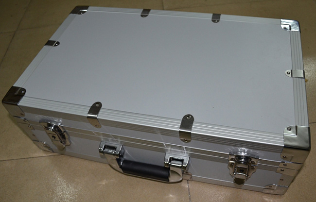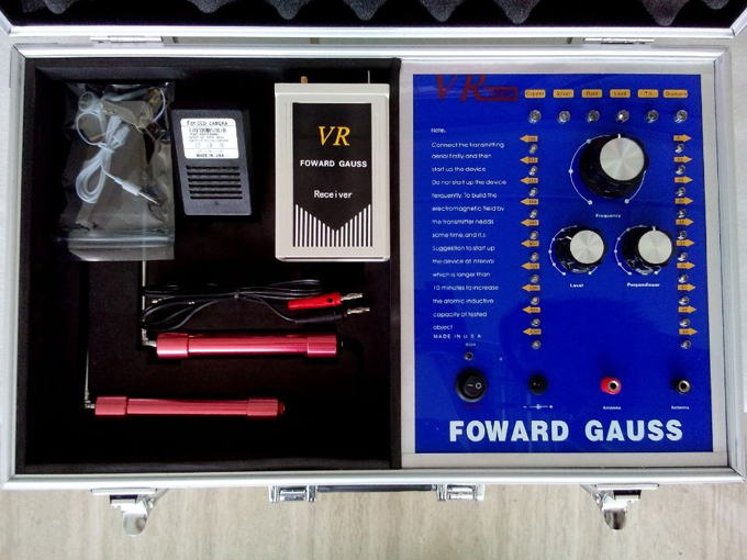 一个镶有铝边并带有把手和两把锁的白色箱子,该箱子里装有发射器和其它 附件。该发射器是安装在盒子里,发射器的面板上有六个LED频率指示灯,且每个指示灯都代表某项功能,字母C开头的表示铜,字母S开头的表示银,字母G开 头的表示金,字母L开头的表示铅,字母T开头的表示锡,字母D开头的表示瓷器玉石。在指示灯的下面有个频率选择开关,可以自由调节您所需要探测的金属种类。频 率选择开关的下面,有两个旋钮,分别标有"水平"、"垂直"字样,分别代表探测深度与范围。左右各有一竖排十个指示灯,可以用水平或者垂直钮来调节您所要 选择的探测深度和探测范围(探测深度为10-100M,每10M一个指示灯共计十个,探测范围为200-2000M,每200M一个指示灯共计十个)。主 机面板最下方一排从左起为电源总开关,电源充电孔,以及一红一黑的两个发射天线插孔。充电电路已经被设计在仪器内部,电池安装在仪器中部的面板下面。(切 记:充电时请先用大陆公司赠送的220V转110V的转换器插入家用电插座然后将充电器接插在转换器上)