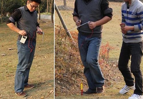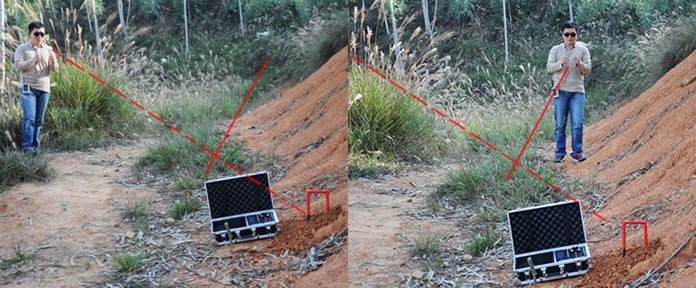 8. 重复第六步。当你接近发射天线和测试物这条线的时候,接收天线应该是交叉的。(记住:测试物和发射天线之间的信号线将会形成,而不是测试物和 发射器之间 的信号线)。当你走过这条线的时候,接收天线将不会交叉。在天线交叉处做下标记。现在,再远离发射器一些距离(如果一。开始距离发射器5到6米,则应到8 米处)。重复上述过程:在接收天线交叉处做下标记。然后通过发射器和做标记的两个地方画一条线,这就是你确定的X轴。关掉发射器和接受器,然后等15分 钟,把发射天线和发射器挪到一个新的地方,重复这一过程。记住要把发射天线埋进去。这次你确定了Y轴,X轴和Y轴的交叉处即目标物所在地。