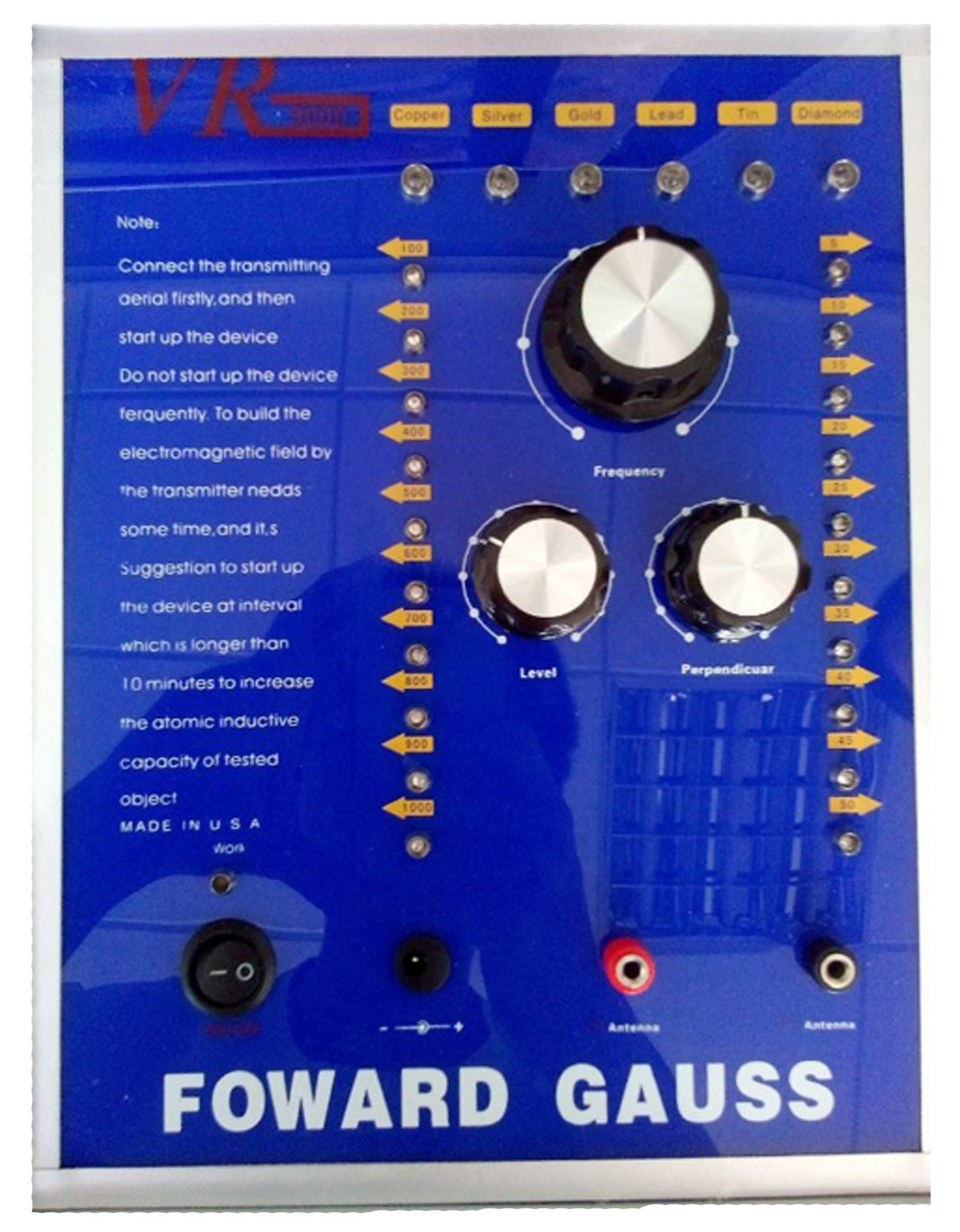 把主机和接收机的电源打开,把发射线框分正负极插在主机红黑插孔,把接 收天线和接收半导体、耳机分别插入IndicateAntennaHeadphones插孔,调动主机上铜、银、金、铅、锡、瓷器玉石档位,在接收机的耳 机里就可以听到相应的金属频率信号所发出来的声音,这表示仪器工作正常。