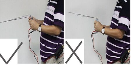 使用者必须以放松姿势站立,两脚稍微分开,双臂紧贴身体但不要太紧。握住接收杆时,手掌和手腕不宜太用力,使其在手中自动达到平衡状态,并始终相互平行。手握杆时,使其与地面平行,以增加其敏感性,或稍微向下倾斜5-8°,
