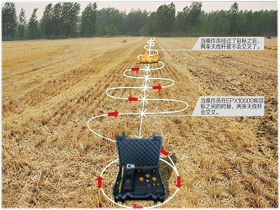 若存在目标物体,当我们走在目标物体和EPX30000地面探测器之间的传输线上时,两杆就会完全交叉。此传输线对于单个目标物来说通常是15厘米宽。我们可以通过仔细检查判断其是否为稳定信号。这样操作者需要返回、放松、再次移动到传输线上。若接收杆每次都会交叉,然后我们可以按照例2中的信号追踪图追踪目标信号。当操作员穿过埋藏的物体后,将无任何显示。目标物就位于***后一次杆交叉位置和无交叉显示的位置之间。金属探测器可用于对目标物体进行精确定位。参照我们的示例,继续练习以取得更好的效果。